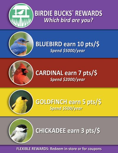 The Birdie Bucks® rewards program has 4 tiers based upon how much you spend in a calendar year and resets every January 1st. You start as a Chickadee and earn 3 Birdie Bucks® points per dollar spent. Once you spend $500 in a calendar year you become a Goldfinch and earn 5 points per dollar spent. Spend $2000 in a calendar year you become a Cardinal and earn 7 points per dollar spent. Spend $5000 in a calendar year you become a Bluebird and earn 10 points per dollar spent. Once you earn a tier it is valid through the end of the following calendar year. This means if you qualify for a tier in year 1 you will have that tier until the end of year 2. If in year 2 you spend less than year 1, in year 3 you will be in the tier based upon year 2 spending unless you achieve a higher tier in year 3 based upon year 3 spending and so on.